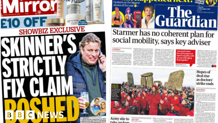 The Guardian leads with an interview with the government’s social mobility commissioner, Alun Francis, in which he says that the government lacks an “overarching narrative” to pull various social mobility policy strands together and urges Sir Keir Starmer to set out a clearer strategy. It also features a photo of people celebrating the winter solstice at Stonehenge.